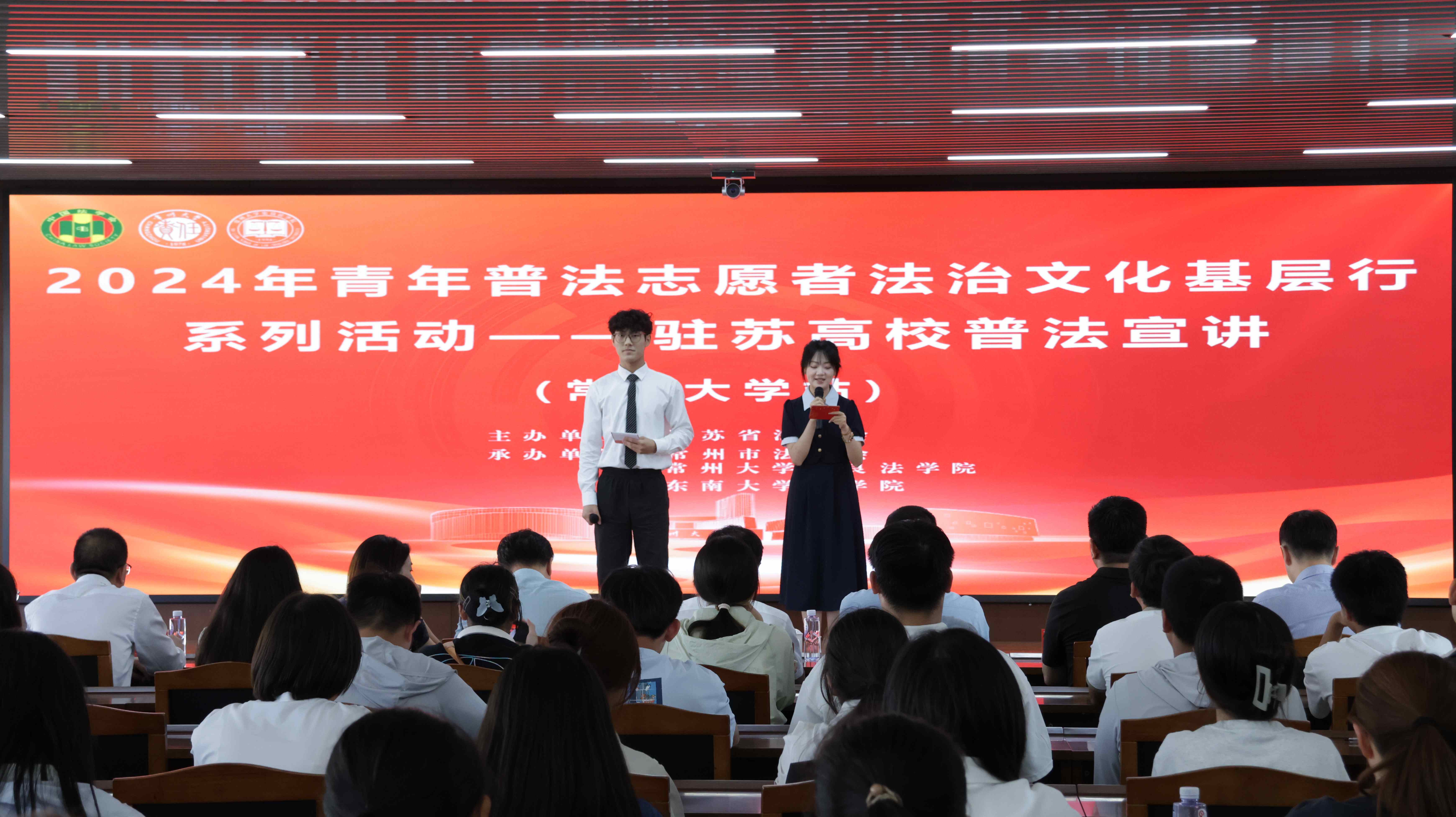 9月28日下午,2024 年“青年普法志愿者法治文化基层行系列活动之高校普法宣讲”beat365官方网站站活动于西太湖校区图书馆报告厅举行。活动由江苏省法学会主办,常州市法学会、beat365官方网站史良法学院、东南大学法学院共同承办。江苏省法学会秘书长高源,beat365官方网站党委常委、组织部部长、统战部部长秦义,常州市法学会专职副会长朱帅,beat365官方网站史良法学院相关负责人出席活动。史良法学院2023级本科生杨文、马韬博主持活动,200余名师生参加活动,“常州政法”抖音号全程现场直播。