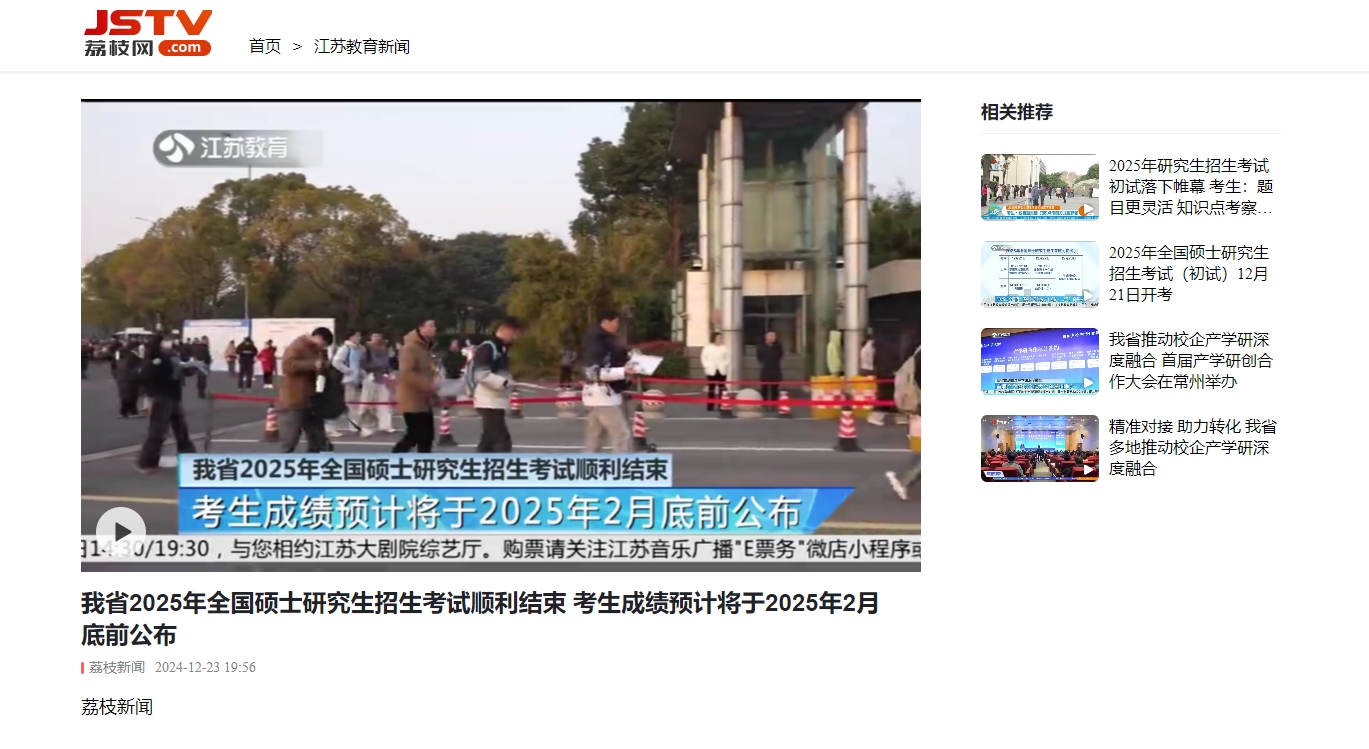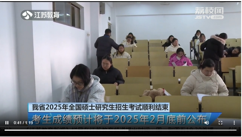 江苏电视台(江苏教育新闻):我省2025年全国硕士研究生招生考试顺利结束 考生成绩预计将于2025年2月底前公布