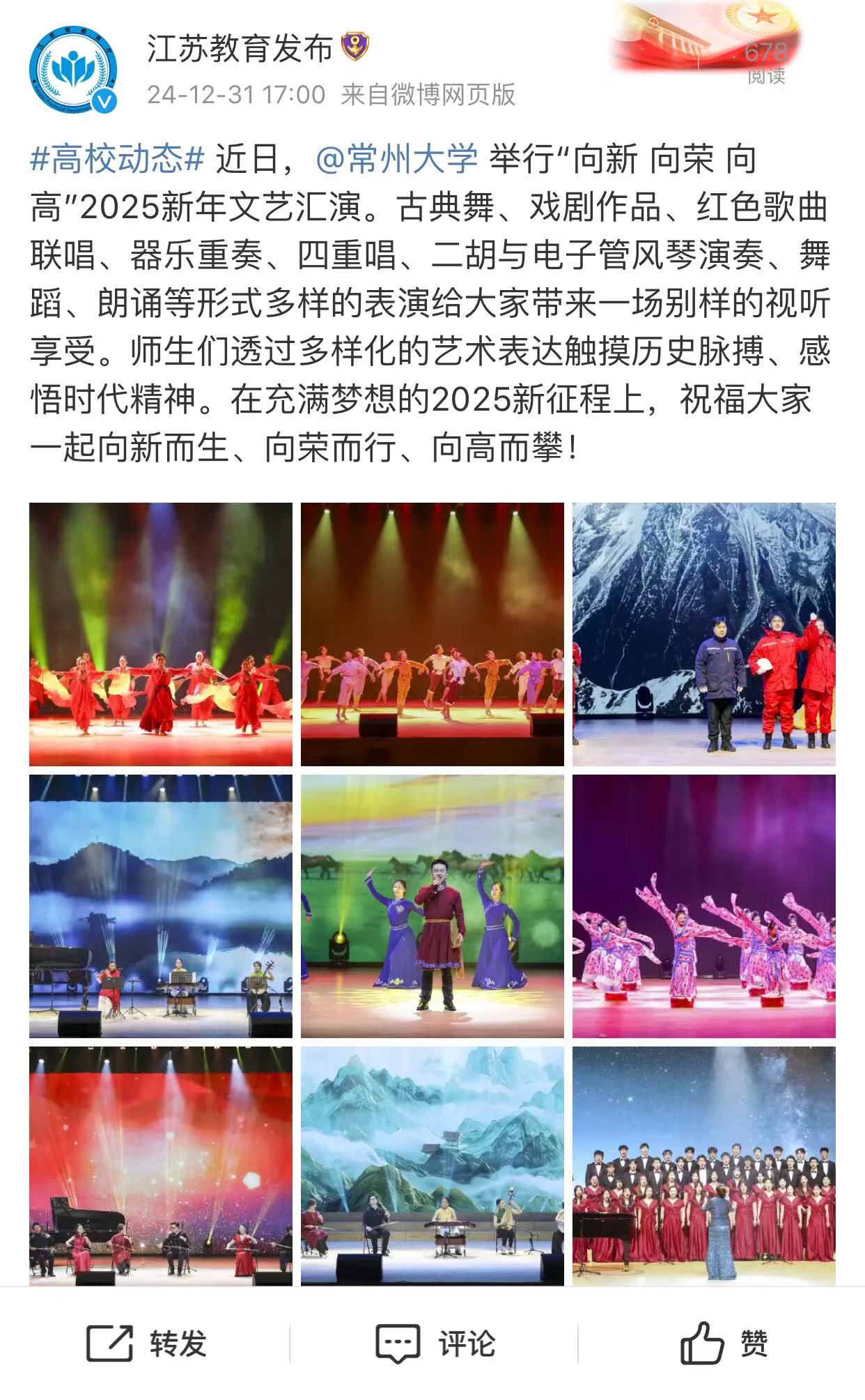 #高校动态# 近日,@beat365官方网站 举行“向新 向荣 向高”2025新年文艺汇演。古典舞、戏剧作品、红色歌曲联唱、器乐重奏、四重唱、二胡与电子管风琴演奏、舞蹈、朗诵等形式多样的表演给大家带来一场别样的视听享受。师生们透过多样化的艺术表达触摸历史脉搏、感悟时代精神。在充满梦想的2025新征程上,祝福大家一起向新而生、向荣而行、向高而攀!