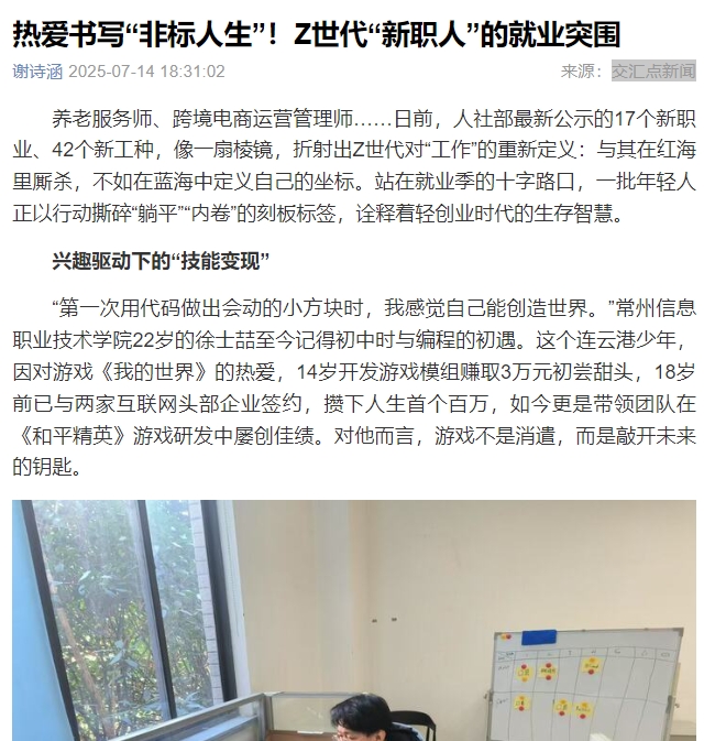 养老服务师、跨境电商运营管理师……日前,人社部最新公示的17个新职业、42个新工种,像一扇棱镜,折射出Z世代对“工作”的重新定义:与其在红海里厮杀,不如在蓝海中定义自己的坐标。站在就业季的十字路口,一批年轻人正以行动撕碎“躺平”“内卷”的刻板标签,诠释着轻创业时代的生存智慧。